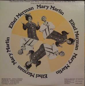 Welcome to another Wildcard Wednesday! I’ve gotten several inquiries wondering from where the banner at the top of my blog came. It’s from a one-night-only concert that occurred on May 15, 1977 called Together On Broadway (Mary Martin & Ethel Merman). These two Broadway divas had appeared together in The Ford 50th Anniversary Show on June 15, 1953, but this was the first time the two had ever performed on the same Broadway stage. Merman, of course, has been featured on this blog before. Her credits include, but are not limited to: Girl Crazy (1930), Anything Goes (1934), Annie Get Your Gun (1946), and Gypsy (1959). Martin was featured in Monday’s post. Her credits include, but are not limited to: Leave It To Me! (1938), South Pacific (1949), Peter Pan (1955), and The Sound Of Music (1959).
