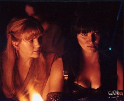 Xena arrives in the next village and finally confronts the woman, a blonde named Callisto, who reveals that she’s the one who shot Xena with the poison dart in “The Greater Good.” After Callisto runs off with Xena’s chakram in tow, Xena puts the punch on Callisto’s right hand man, Theodorus. He tells Xena that Callisto’s family was killed by Xena’s army when they raided and burned the village of Cirra many years ago. Callisto is now seeking revenge by attempting to tarnish the Warrior Princess’s reputation. Theodorus also reveals that Callisto’s headed to murder the Oracle of Delphi and pin the crime on Xena. Melas has witnessed the whole thing and apologizes for his error. He decides to travel with Xena and Gabrielle. Meanwhile, Joxer visits Callisto’s hideout and asks to be a part of her army. After laughing at him, Callisto tells the fool that he must prove himself to her — by capturing Gabrielle. That night, Xena and Gabrielle have a heart-to-heart by the fire, and Xena tears up as she recalls her responsibility in the burning of Cirra.