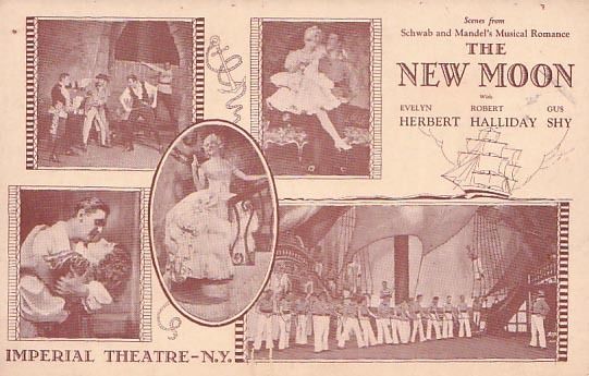Earlier in this series, I presented Friml, Stohart, and Hammerstein’s Rose-Marie (1924), an operetta with a score that I believe is one of the most accessible to audiences who’ve not yet cultivated a taste for the distinct genre. Well, The New Moon — given how laughably stylized it is today — must not only be appreciated for its glorious Romberg and Hammerstein score, but also for its, well, BIGNESS. It’s here, it’s operetta, and it’s wonderful. And though Rose-Marie (1924) may seem just a trifle closer to what we have come to know as musical comedy (i.e. silliness, peppy danceable foxtrots, etc.), you would be hard-pressed to find an operetta score as sublime as The New Moon‘s — especially since its sound transcends both operetta and musical comedy in its audibly aesthetic ability to move its listeners. (You’ll find out in a moment.)