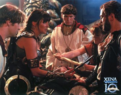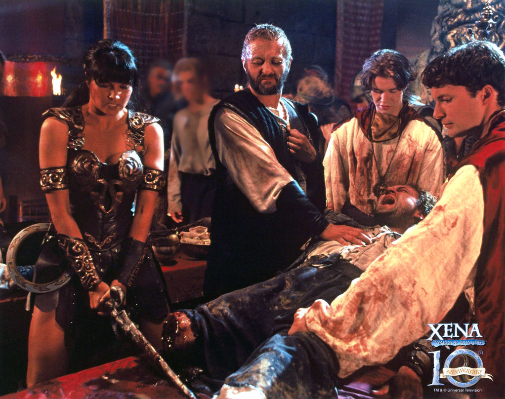 T.J. Scott (Director): “My favorite scene in [this episode] is inventing CPR and Xena waking up Gabrielle and saving her. Having that moment that you realize that this rag-tag little girl that Xena had picked up along the way, who was a bard, who was a bit of an annoyance, she was falling in love with. And the tears of, ‘I’m about to lose someone that I love,’… [This episode] was [also] really interesting in terms of gore and guts and what we could do. We were doing a story that dealt with tracheotomies, with cauterizing amputated legs, [and] there was a lot of blood that went in there. It was difficult to know, in our time period, what we could put on the air. I did a cut of that show that the censors would not pass. And Rob Tapert, and Lucy Lawless, and Eric Gruendemann fought the network, fought the censors, fought everyone, and we held that show for three months. It didn’t air when it was supposed to, and Rob Tapert said, ‘I love this so much the way it is… right now, that I don’t want to trim it.’ And there were sequences in there were the censors said, ‘You are showing on camera a leg being cut off.’ Rob said, ‘No we’re not. It’s all in the cutting, it’s in your mind. You’re hearing it.’ And they had to go back frame-by-frame and see that we had created a sequence where in their mind they thought a leg was being chopped off on camera, but it wasn’t. In the end I think 60 seconds of my original cut got taken out and had passed. That’s how it aired…” (What You Didn’t Know About Xena – Exclusive Bonus on Best Buy Season One DVD Release)