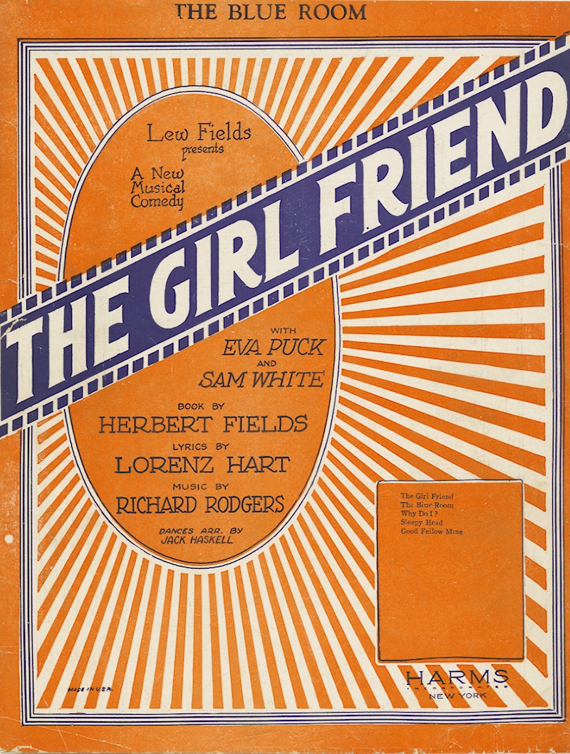 Rodgers and Hart composed a jaunty score for this easygoing vehicle for husband and wife team Sammy White and Eva Puck. Lew Fields produced, while his son Herbert wrote the admittedly thin book about a dairy farmer who plans to enter a six-day bicycle race to impress his girl, the daughter of a professional cyclist. After the original 1926 production, the show premiered in London the following year with a book adapted from 1926’s Kitty’s Kisses and mixing the Rodgers and Hart score with Gus Kahn and Con Conrad’s. It was a variation of this mishmash that toured Britain in 1987. But the full original score has not been heard since outside of a few small concert productions (like Musical Tonight!’s in 2004). The show’s relative obscurity — and unrevivability — is largely a result of the duo around whom it was crafted. Also, compared to the progressive and narratively solid work of Dearest Enemy, The Girl Friend is fluff, although the score is definitely a delight. And there are some magnificent (and well known) tunes. So, in keeping with the show’s simplicity, today’s post is easy, breezy, and ready to present you with some of the delightful tunes from Rodgers and Hart’s The Girl Friend. Up first, the most well known number, “The Blue Room,” in a period rendition by jazz violinist Joe Venuti and the Blue Four. Harold Arlen is the vocalist! (Check out Hart’s marvelous lyrics here.)