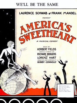 Rodgers and Hart returned from their first Hollywood sojourn with an eye to lampoon the cinematic medium, and with book writer and frequent collaborator Herbert Fields, they paired with Monty Woolley as director to create America’s Sweetheart. The production starred Harriette Lake and Jack Whiting as a pair of lovebirds who go West to get fame, but her career takes off while his languishes (as does their romance). However, the tables turn with the advent of sound, as the new starlet’s lisp makes her undesirable. After his star goes on the ascent, he takes her back and all ends happily. Although most found the show charming, spoofs of Hollywood had already become popular on the Great White Way, and so the story (along with the score) was deemed too familiar. But the cast was strong; in addition to Whiting and Lake (who would go West herself and adopt the stage name Ann Sothern), there was Jeanne Aubert as a French movie star (you’ll remember her as the strange portrayer of Reno in the Original 1935 London production of Anything Goes), Inez Courtney as one half of the secondary couple, Virginia Bruce in a small role, and the Forman sisters, a singing trio whose moments landed well.