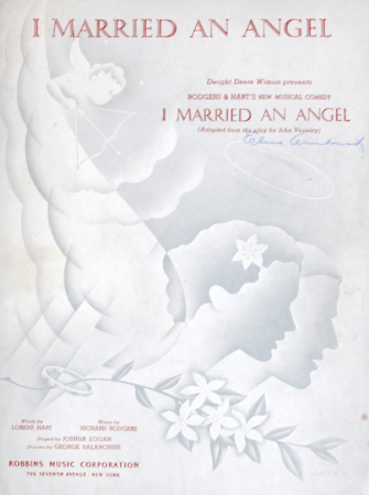 Originally a film in development during their tenure with MGM in 1933, the boys bought back the property (with MGM given a first refusal to the film rights should the stage production become a success) and contributed both the score and the book. George Balanchine once again choreographed (and there was some ballet), while young Joshua Logan staged the book scenes — and this was noted as being the wordiest of the spotlighted duo’s late ’30s works. The story, adapted from a Hungarian play, starred Dennis King as a banker who literally marries an angel, played by Vera Zorina, and contends with her struggle to adapt to life on Earth among mortals. Vivienne Segal, who would go on to play two more iconic R&H roles, was King’s supportive sister, Walter Slezak was his boss, Audrey Christie was his ex-girflriend and Charles Walters played his secretary and friend. The show was a hit, for all involved, and MGM did indeed make a film in 1942. As usual, it wasn’t in any way an accurate reflection of the stage play. But due to the soundness of the book and the charm of the score, which wasn’t padded with unnecessary numbers (only eight original tunes played Broadway), I Married An Angel has seen a number of small scale revivals, and attempts have been made to resurrect the work.