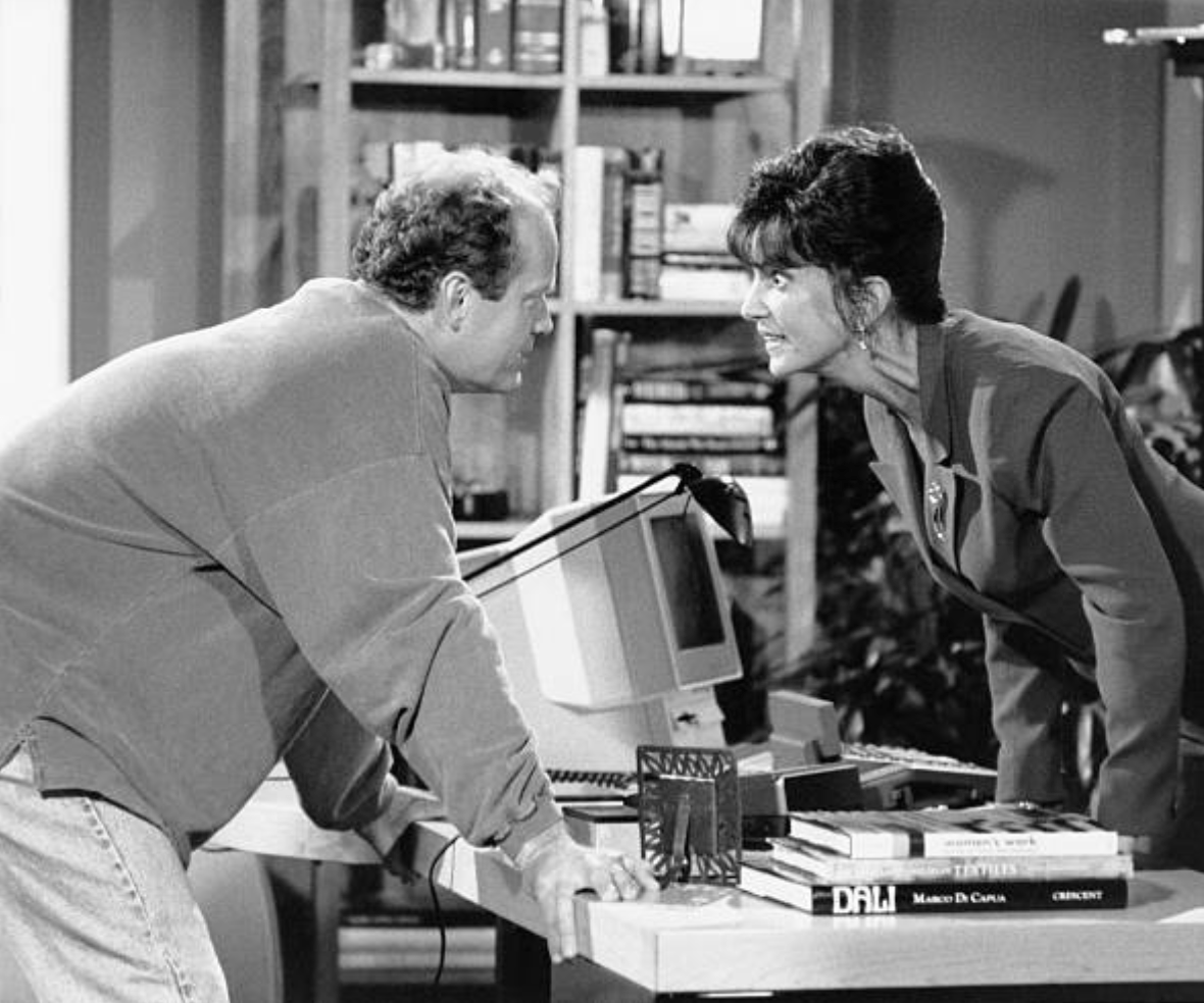 I introduce this concept here because, if we call Season Two the series’ peak (as I’ve done — you may feel differently, which means the principle still holds; it just adjusts based on your chosen positioning), then the start of Three naturally forms the first opportunity to make note of how the series is “not what it used to be.” However, because I consider this dip so slight — especially when we view it in hindsight, knowing everything that’s to come — there’s no doubt in my mind that a “red line” shouldn’t be drawn between Two and Three, for even though the year isn’t as perfect as its predecessor, it’s darn near close… In fact, I’d argue that the differences between Two and Three are more situational (narrative) than they are aesthetic (style). To wit, of the talented folks giving Frasier its character-based voice — the writers — the only credited staff loss from the prior year is the duo of Elias Davis & David Pollock. Season Three, rather, is an additive period, featuring the efforts of new scribes Rob Greenberg (Love & War, We Are Men, Impastor), Suzanne Martin (Ellen, Hot In Cleveland, The Soul Man), and one-season wonder Jack Burditt (Just Shoot Me!, 30 Rock, The Unbreakable Kimmy Schmidt), and while some of these new folks might not have their names listed (yet) on the year’s best scripts, all the rest of last season’s terrific team is on hand contributing to every single entry. Any perceived changes then, may be more attributed to the unavoidable decline in narrative novelty… As we’ve explored with past shows, novelty mixed with quality is an intoxicating combo — and this becomes clear when the former wears thin. (Another example: Murphy Brown, whose third season also was a comedown from the peak second year, but, again, not a major one.) So, when novelty — the inherent freshness of these characters and the stories that both their personas and status quos readily inspire — is no longer a reliable boost, then the show’s storytelling has to change. All the best and most obvious ideas for these players have already been fulfilled based on who we know them to be; now, their ability to motivate comedic plots is contingent on their evolutions.