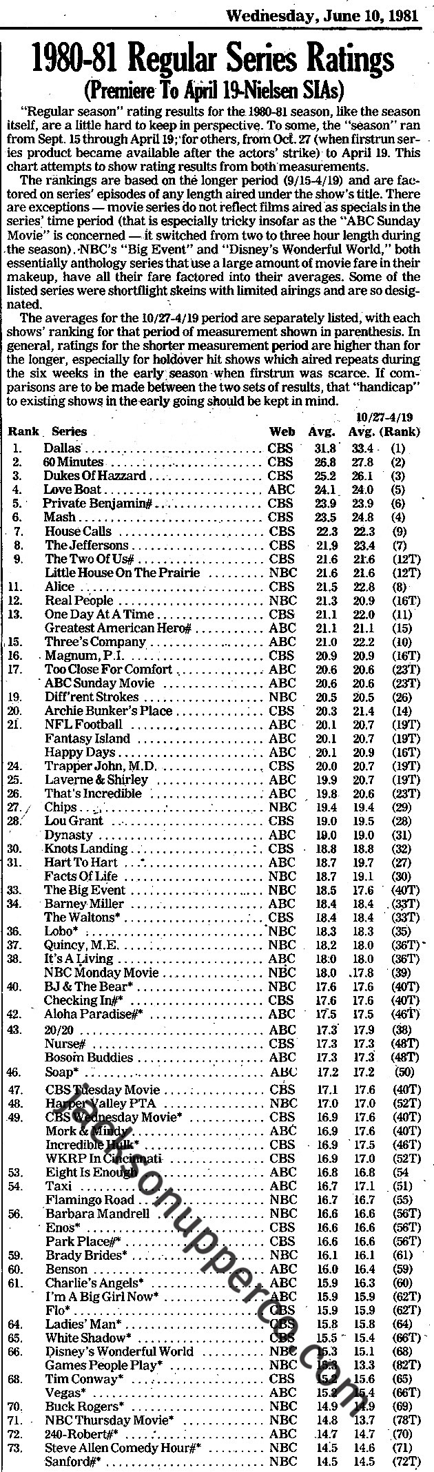 As I told you, I would have liked you to publish the Nielsen lists released by Variety after 1979 if you have some … It seems to me that there are still some from 1979 to 1980 and 1980 to 1981 and maybe beyond … But I never got to see them