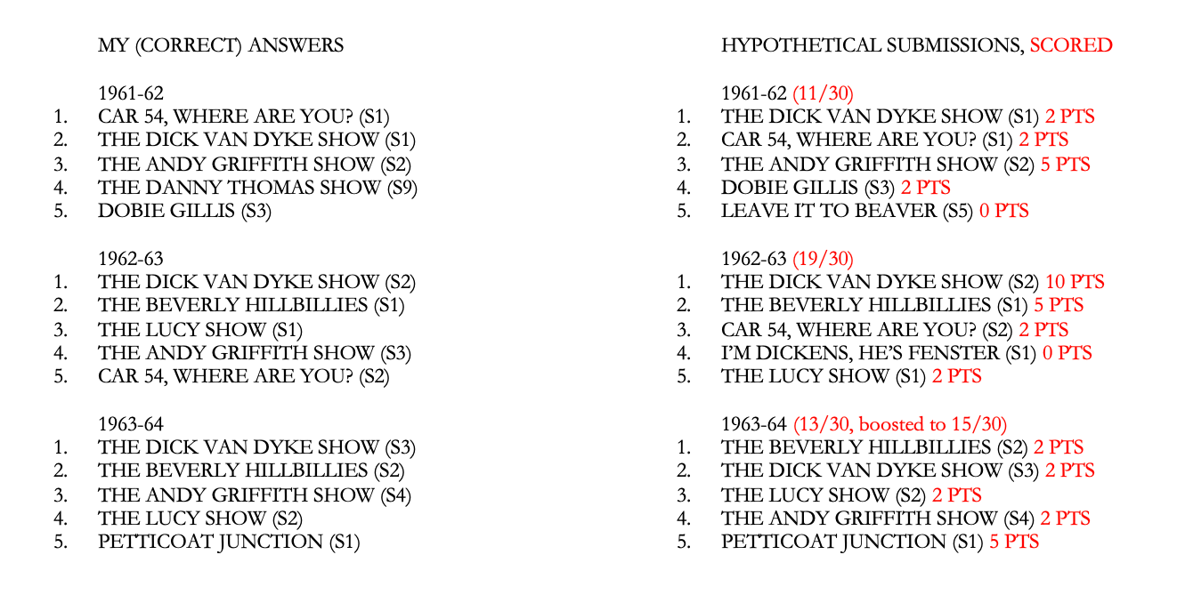3. Keep in mind that the answers under each annual heading are ranked. That is, I’m asking you to not only guess my five favorite sitcom seasons from 1970-’71; you should also try guessing my top favorite, second favorite, third favorite, fourth favorite, and fifth favorite from that year… in order. See the example below (EXHIBIT B)