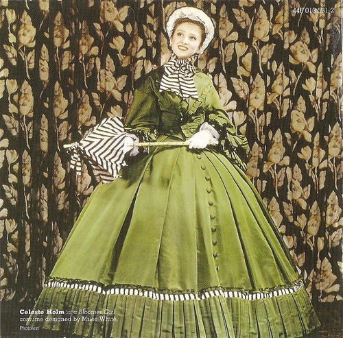 The show is set in 1861 Cicero Falls; Holm (later replaced mid-run by Nanette Fabray) plays Evelina, the only unwed daughter of hoop skirt manufacturer, Horatio Applegate (Matt Briggs). But rebellious Evelina has fallen under the tutelage of her Aunt Dolly (Margaret Douglass), an ardent suffragette and originator of the bloomers. To straighten his daughter out, Applegate decides to arrange a marriage between Evelina and Kentucky hoop skirt salesman, Jefferson Calhoun (David Brooks). But Evelina is wary of the Southerner and tests Calhoun by tricking him into releasing his slave, Pompey (Dooley Wilson), whom he helps escape to the North. But this causes friction between Jeff and his brother Hamilton, who objects to the freeing of family property. As Jeff wavers about his decision, Evelina shocks the town by dropping her hoop skirt at a garden party to reveal a pair of Aunt Dolly’s bloomers. She and the rest of the Bloomer Girls are arrested at the end of the first act.