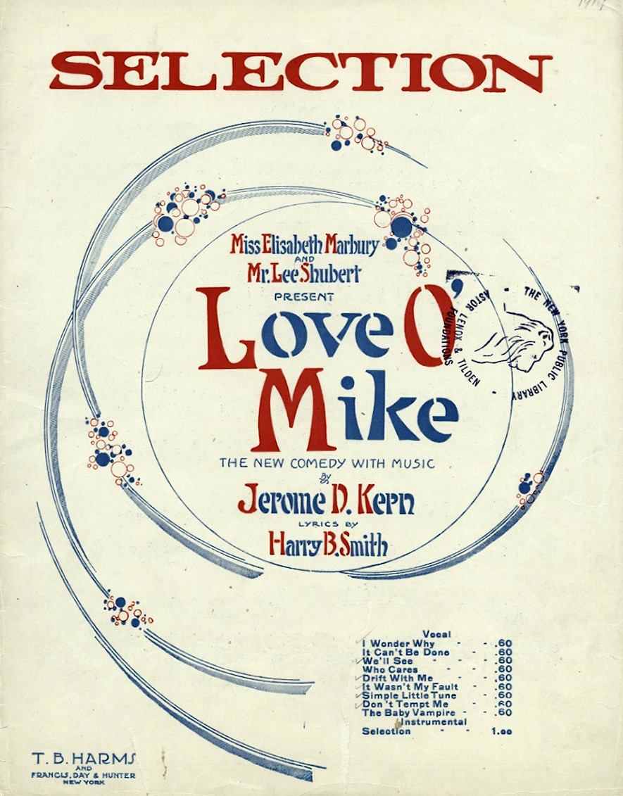 Just four days after the premiere of Have A Heart at the Liberty, another show with a Kern score premiered at the Shubert, although this time, our spotlighted composer was not working with the other members of the “dream team” (namely, Guy Bolton and P.G. Wodehouse), but lyricist Harry B. Smith, with whom he had collaborated previously, and book writer “Thomas Sydney” (a pseudonym for both Augustus Thomas, Jr. and Smith’s own son Sydney). By all accounts, the script was as sophomoric as the premise, which concerned a ladies man who inspires jealousy among the other fellas at a high society party. Oh, and there was a subplot involving a thieving butler. If there was any concrete case to be made for just how much Bolton and Wodehouse brought to the Princess Theatre Shows, Love O’Mike would be Exhibit A.