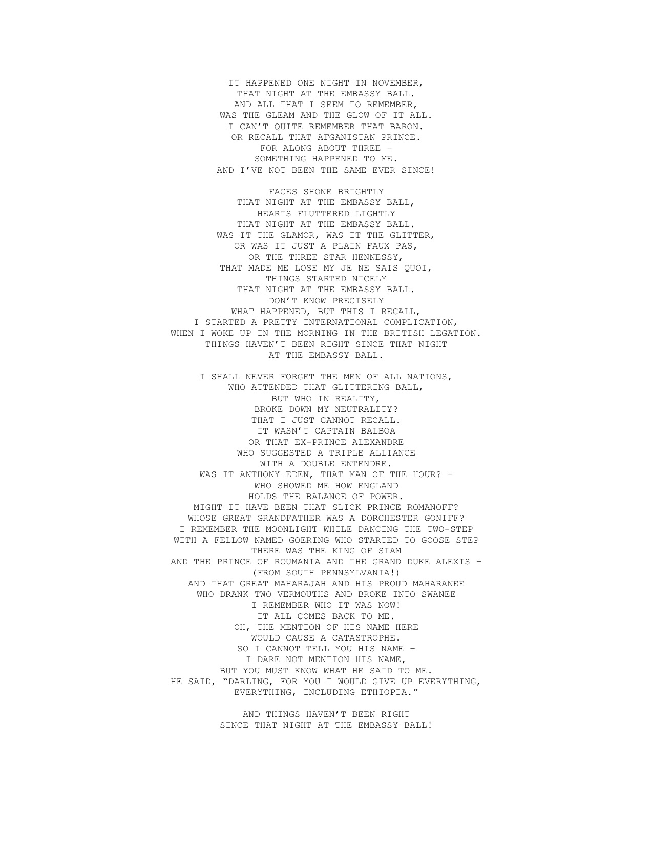 Several notable songs emerged from the uniformly strong score. The most famous of which was “Down With Love,” which was led by Vance, Whiting, and Clyde as they tossed things into a bonfire and ended the first act. Vance had two other songs. The first was “Moanin’ In The Mornin’,” in which Stephanie decides to stop carrying torches. The second, which I have never had the pleasure of hearing, entitled “The Night Of The Embassy Ball,” was singled out by the critics for being extra lascivious. Here are the lyrics: