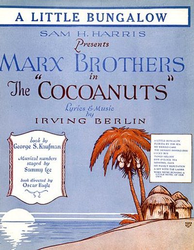 Classic movie fans may remember the 1929 film adaptation of “The Cocoanuts”, which, although jettisoning most of the delightfully infectious Irving Berlin score, retained much of the plot and presented the Marx Brothers (minus Gummo, who left showbiz early in the boys’ career) in their first feature length film. They were joined by their perfect foil, the huffy Margaret Dumont, who was also in the 1925 stage production. As with most Marx Brothers affairs, the plot of “The Cocoanuts” has been notoriously labeled as insignificant. But, as we’ve seen in past weeks, book triviality is a trait common to musicals of the ’20s — Marx brothers or no Marx brothers. What perhaps may be uncommon (at least, in regard to the superior musicals that I’ve been presenting to you) is that the score is also rendered less important than usual.