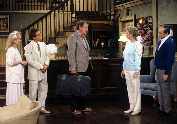 But while there’s ample evidence to support a narrative regarding the show’s history of casual (and perhaps situational) pre-finale metatheatricality, I’m less convinced that the last episode reinforces the series’ supposed bent towards surrealism. (From my research, the world “surreal” wasn’t commonly used to describe Newhart until the final episode.) I’ve already spent several weeks opining that such a label serves merely as a convenient excuse for loyal fans who need to justify staying connected during moments in which illogical stories or unbelievable characterizations fail to live up to the MTM standard (which Newhart, through its star and ensemble construction, always told us was important), making us want to emotionally divest. Now, I don’t dispute that the series, as it’s progressed, has become less logic-beholden — and not completely without intention; that is, this drift hasn’t been solely accidental, for the show’s focus has generally always been big comedy (again, as a necessary diversion). However, I don’t believe Newhart ever prioritized the surreal over the real, or even let this ridiculousness get so out-of-hand that it deserved to define the series. No, the show isn’t, to my mind, ever enveloped by absurdity, but rather by its dubious relationship with logic — a byproduct of wild broadening, which many would rather call something more artful. (See Season Five’s list for more.) To wit, I don’t think we’re supposed to doubt the universe’s veracity until the finale’s final scene; if we were, it wouldn’t have packed a punch, right? Furthermore, I don’t think at any time before the start of the last episode, in which the show is conclusively aware of how it’s closing, that Newhart’s universe was meant to be perceived as anything but “real” – with the heightened players and self-reflective gags standing as comedic outliers meant to keep us from considering a disconnection from actual illogicalities – i.e. “hey, look at this shiny object.”