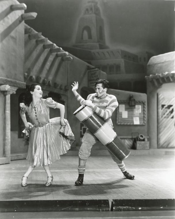 As you can see, the story is nothing incredibly new — it takes the tropes common to collegiate shows of the past few decades and adds a bit of the Western Girl Crazy (1930) flair. But there are touches of, as I mentioned earlier, personality. To be more specific, there are nuances, distinctions. Most of these occur in the rich score, which include the riotous Latin stylings of Costello and Arnaz, but there are some very funny and very original bits in the book as well. One thing that immediately comes to mind is the Pottawatomie tradition of having all the female virgins wear yellow beanies. This naturally sets up some comedy, because as the woman “falls,” so does her beanie. (This gag was actually kept in the 1940 film adaptation.) In fact, it is reported that one of the most memorable moments of the original production occurred when Bracken’s character found the yellow beanie belonging to Tallulah Lou (Leila Ernest), his southern belle girlfriend, hanging from the muzzle of a cannon (along with various other undergarments)!