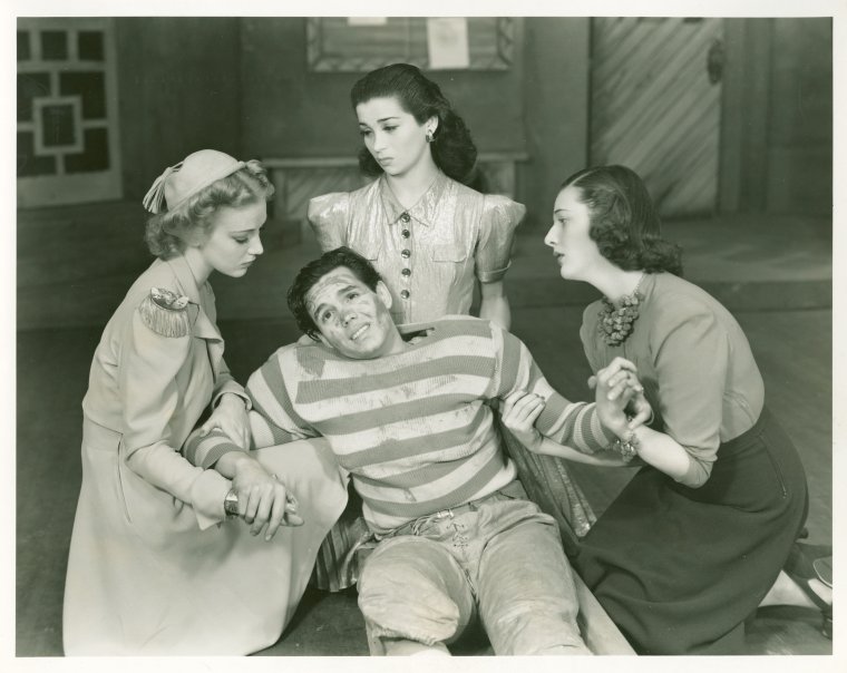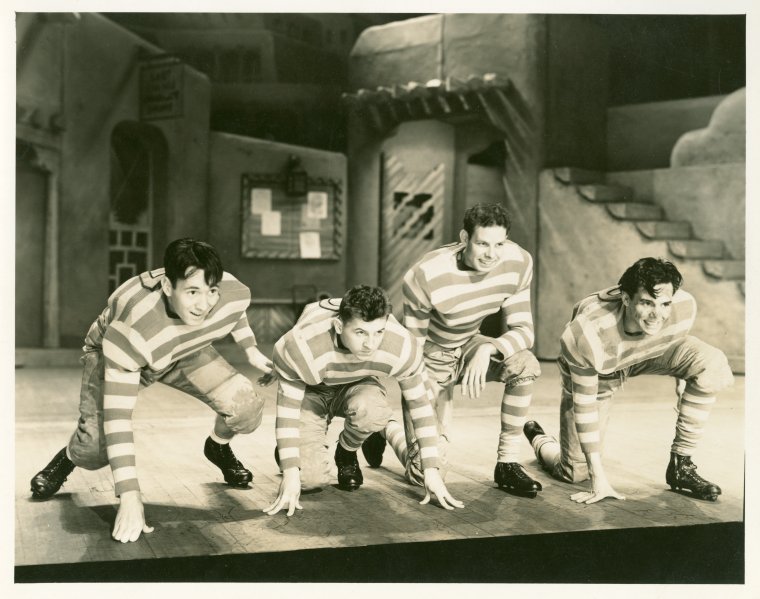 Flighty heiress Consuelo Casey (played originally by Marcy Wescott) returns from Europe and decides she wants to attend college. But not Vassar, like her father suggested; Connie wants to go to Pottawatomie University in Stop Gap, New Mexico to be near snobbish playwright, Beverly Waverly. So Connie’s father secretly hires four Ivy League football players to accompany his daughter and be her bodyguards. As Princeton’s Clint Kelley (Richard Kollmar) begins to fall for Connie, he and the three other chaperones — Argentina’s conga-beating Manuelito (Desi Arnaz), Harvard’s wisecracking Jojo (Eddie Bracken), and Yale’s dancing Al (Hal LeRoy) — join the sagging football team and lead it to victory in a glorious first act finale.