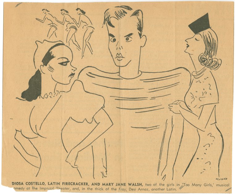 Arnaz really became the breakout star of the original production, even though all of the others received similar attention at the time. In addition to the number mentioned above, he and lead heartthrob Kollmar teamed up with the co-eds for “Tempt Me Not,” and Arnaz’s drum stylings dominated in Walsh’s first act finale, “Look Out,” which saw the football team victorious, turning the stage into a giant conga line that apparently had the audience on their feet with excitement. Perhaps more structurally surprising, Arnaz, and not Kollmar, got the title song. Of course, since Manuelito was the playboy of the posse, it makes most sense coming from his character.