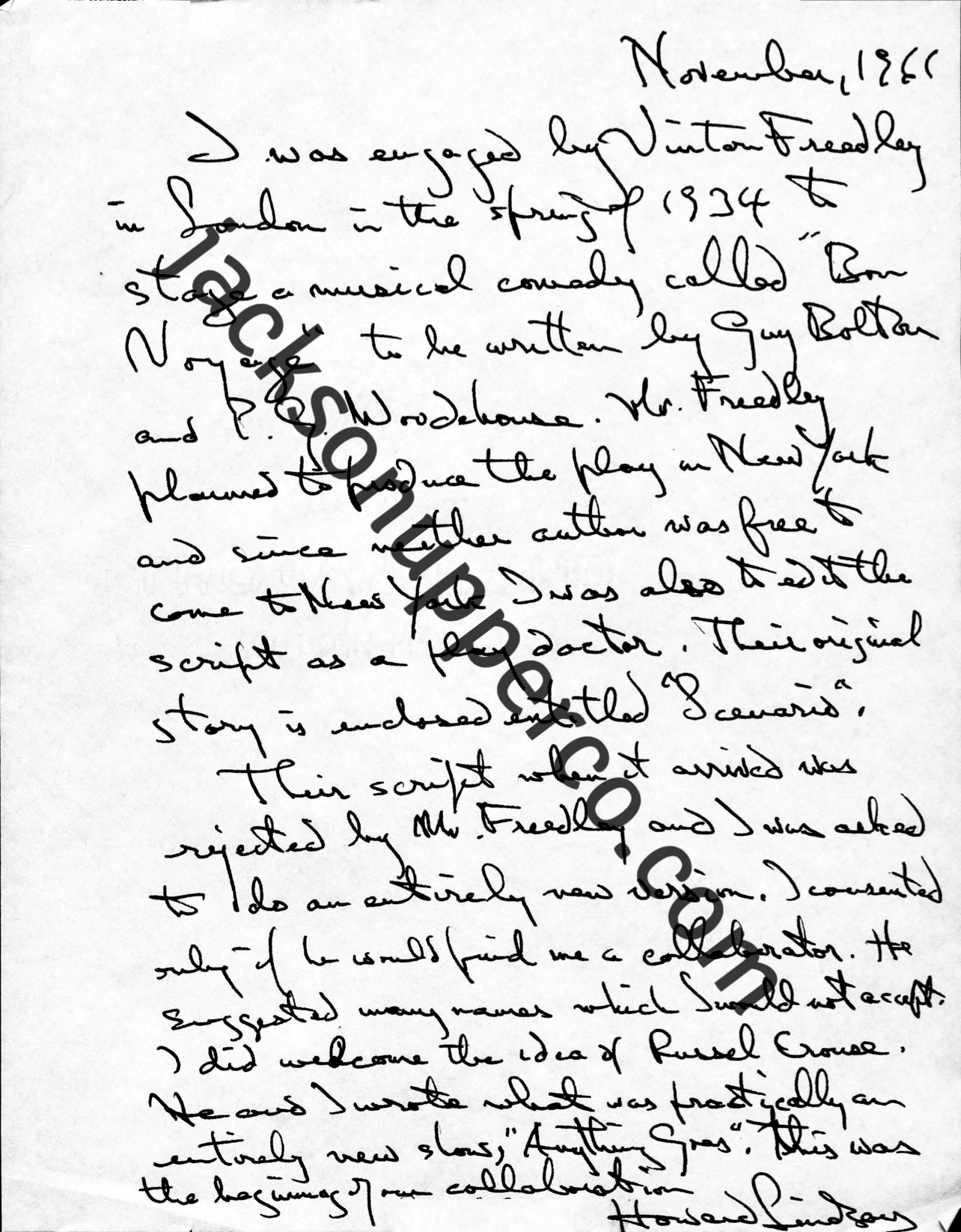 I was engaged by Vinton Freedley in London in the spring of 1934 to stage a musical comedy called “Bon Voyage” to be written by Guy Bolton and P.G. Wodehouse. Mr. Freedley planned to produce the play in New York and since neither author was free to come to New York I was also to edit the script as a play doctor. Their original story is enclosed entitled “Scenario.” Their script when it arrived was rejected by Mr. Freedley and I was asked to do an entirely new version. I consented only if he would find me a collaborator. He suggested many names which I would not accept. I did welcome the idea of Russel Crouse. He and I wrote what was practically an entirely new show, “Anything Goes.” This was the beginning of our collaboration.