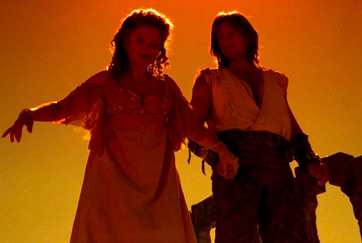 The premise involves mankind’s loss of both fire and healing abilities after Hera chains up Prometheus. Xena must retrieve the only thing that can break the chains — the sword of Hephaestus — however, whoever strikes the chains will die. So, Hercules joins the mission, determined to free Prometheus himself and keep Xena from death. Meanwhile, Gabrielle tends to a wounded Iolaus, who hovers near death until Prometheus is freed. I won’t spoil things for you, but needles to say, none of the foursome dies. (It’s too early in the season for a death. Those normally come near the end of the seasons or right at the very beginning.)